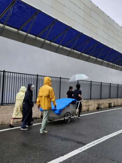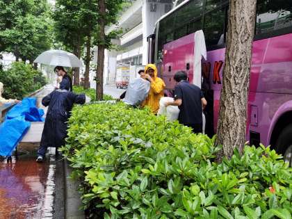 雨の中、荷物の積み込み、教職員の応援に感謝します