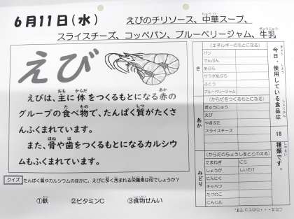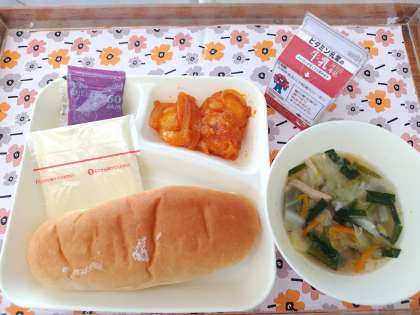 6/11今日の給食は「えびのチリソース、中華スープ、スライスチーズ、コッペパン、ブルーベリージャム、牛乳」です。