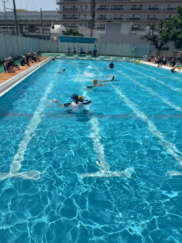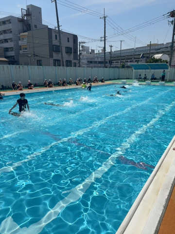 5時間目、快晴の空の下、5年生がプールでクロールの練習に励んでいました。力強く泳ぐ子もいれば、水をかきながら一生懸命進もうとする子も。水しぶきの向こうに子どもたちの頑張りがきらきらと輝いていました。