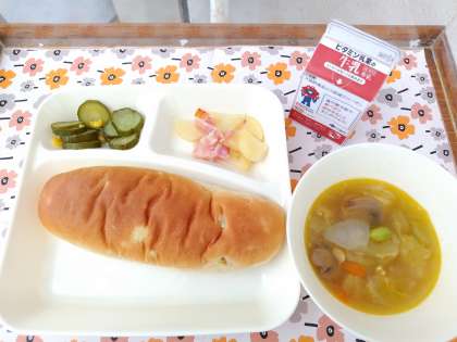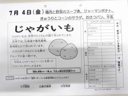 7/4今日の給食は「鶏肉と野菜のスープ煮、ジャーマンポテト、きゅうりとコーンのサラダ、おさつパン、牛乳」です。