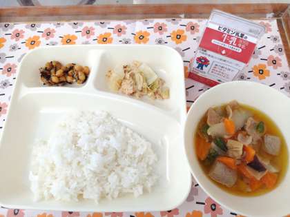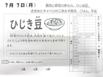 7/7今日の給食は「豚肉と野菜の煮もの、ひじき豆、ささみとキャベツのごまみそ焼き、ごはん、牛乳」です。