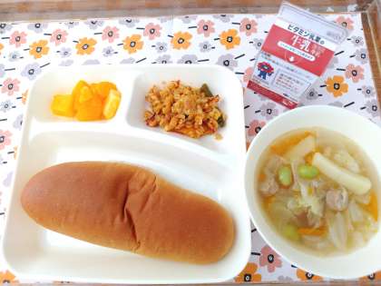 7/16今日の給食は「押麦のチキンパエリア、ウインナーとキャベツのスープ、ミックスフルーツ(缶)、黒糖パン、牛乳」です。