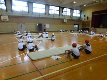 5月11日(水)今日もあいにくの雨となりました。4年生は体育の時間に体育館でマット運動をしました。先生の説明を聞いているところです。