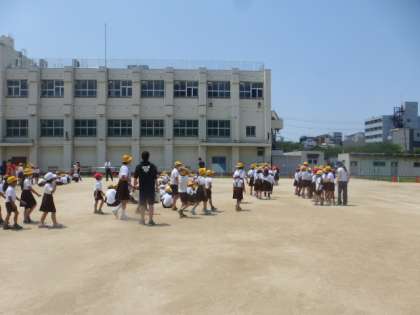 5月23日(月)今日も夏を思わせるような暑さになりました。全学年がたてわり班に分かれて各教室で会議をしました。会議の後、たてわり班ごとに運動場に並びました。