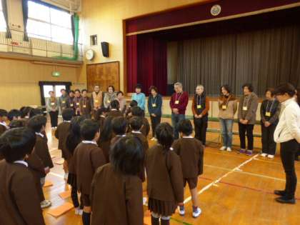 1月25日(水)厳しい寒さが続きますが、よいお天気となりました。地域の方々にお越しいただき、1年生は、昔遊びを教えていただきました。I