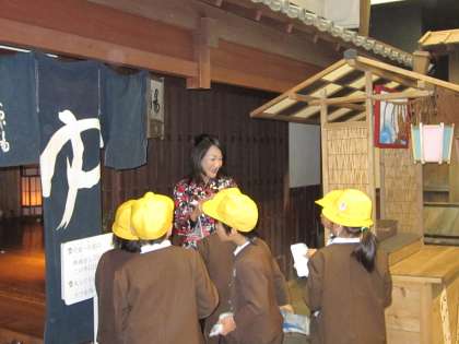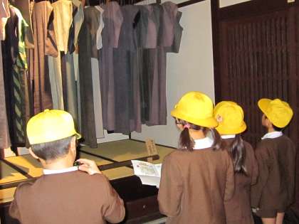 まず、スタッフの方に昔の道具を紹介していただきました。今は使われなくなった蓄音器や昔のアイロンにはみんなもびっくり。現在の生活が、いかに便利なものかを感じたようでした。また、代表の子どもたちは着物などの昔の服を着用させてもらい、しばらくはその姿で館内を見学しました。