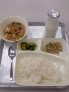 今日の給食は麻婆豆腐、きゅうりの甘酢あえ、もやしとピーマンのごまいため、ご飯、牛乳です。