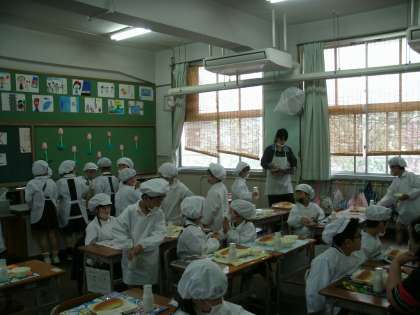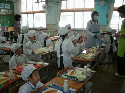 1年生の給食風景です。給食室からの運搬は6年生に助けてもらっていますが、