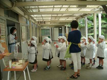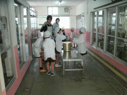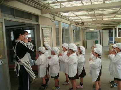 給食室の前でアルコール消毒をし、服装チェックの後、元気よく「いただきます。」