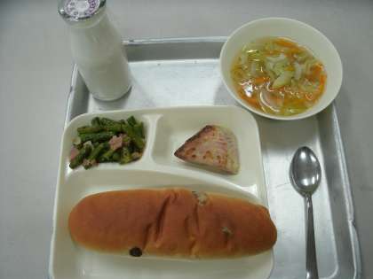 今日の給食は、かつおのガーリックマヨネーズ焼き、スープ、グリーンアスパラガスのソテー、レーズンパン、牛乳です。グリーンアスパラガスが畑で芽を出すのは、春先から夏の初めです。このころにとれるものが、とてもおいしいと言われています。アスパラガスに多く含まれていることから、その名前がついたアスパラギン酸は、疲れをとる働きがあります。