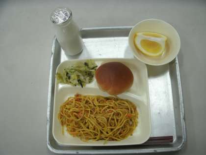今日の給食は、カレースパゲッティ、キャベツのひじきドレッシング、かわちばんかん、黒糖クレセント、牛乳です。