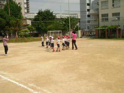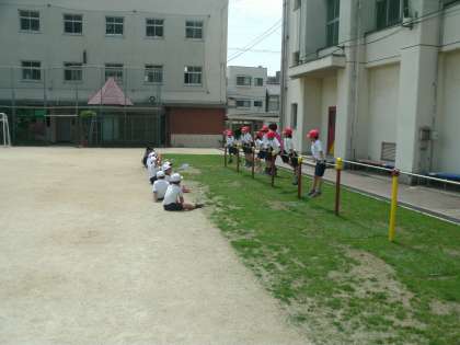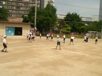 1年生は体育の授業がありました。鉄棒、フラフープ、集団での活動の3種類に取り組みました。鉄棒ではまず自分の体が支持できるところから始めます。フラフープでは二人組で転がしてキャッチしました。集団での活動ではみんなで手をつなぎ、手を離さないように体型をかえる動きに挑戦しました。できたときはみんな大喜びでした。個々の動きを高めることも大事ですが、運動することを通して、できた喜びを感じ、お友達とのチームワークを高めていってほしいです。