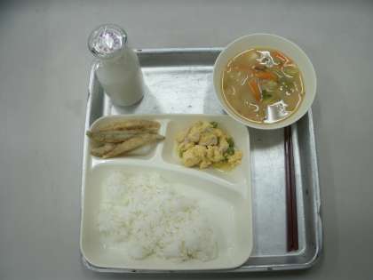 12日は、きびなごのてんぷら、みそ汁、えんどうのたまごとじ、ごはん、牛乳でした。えんどうの旬は春から夏の初めにかけてです。