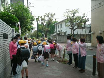 港区更生保護女性会の皆さんが、「愛の一声運動」で正門前に立ってくださっています。「おはようございます」という元気な挨拶が響きます。