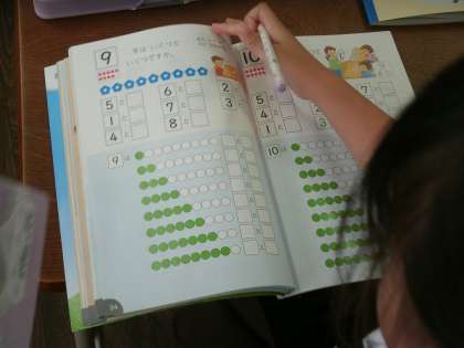 1年2組は、算数の学習中です。「9はいくつといくつ」を勉強していました。