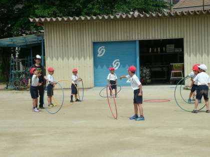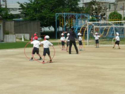 1年2組は、輪を使った運動をしていました。大きなフラフープを上手にあつかっていました。