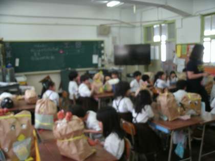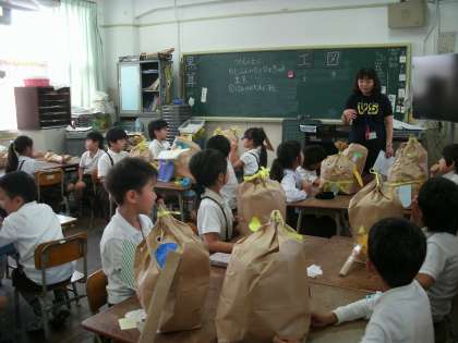 2年2組は、図工の学習をしていました。「くしゃくしゃぎゅっ」という作品の鑑賞会をしていました。友達の作品の面白いところやすごいなと思ったところを発表しているところです。