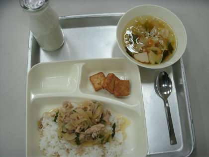 今日の給食は、豚丼、五目汁、厚揚げの生姜醤油かけ、牛乳です。