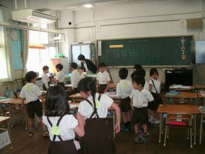 1年1組は、算数の学習をしていました。「10はいくつといくつかな」の学習中です。背中にはってあるカードの数字とあわせて10になるカードの友達を、ひとこともしゃべらずに見つけてペアになるというゲームをしていました。