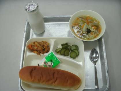 今日の給食は、じゅがいものミートグラタン、スープ煮、きゅうりのバジル風味サラダ、マーガリン、コッペパン、牛乳です。