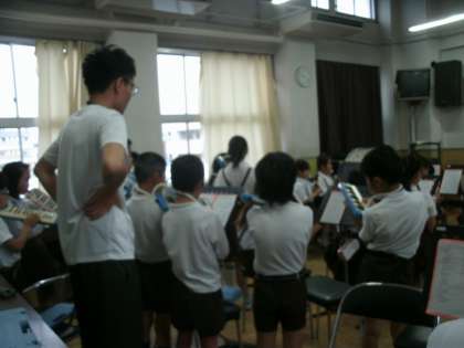 4年生は、1組、2組合同で合奏の練習をしていました。音楽室で、「みんながみんな英雄」の合奏に取り組んでいました。