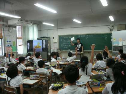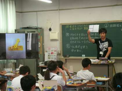 4年1組は、理科の学習をしていました。電池をつなぐ向きと、モーターが回る向きの関係について調べていました。