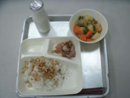 今日の給食は、鶏肉のてり焼き、じゃがいもとあつあげの煮もの、ごまかかいため、ごはん、牛乳です。