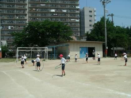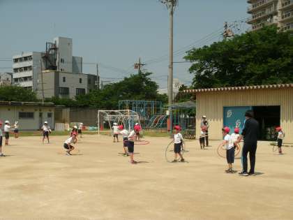 1年2組は、体育で体操リングをつかって、縄跳びのような運動をしたり、フラフープをしたりしていろいろな動きに挑戦していました。