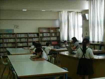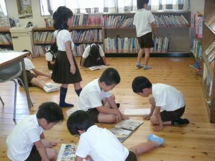 2年2組は、図書室で読書をしていました。本校の図書室の床は天然木を使用したぬくものある床です。夏は涼しく、冬は暖かく、とても快適です。低学年の子どもたちは、床に絵本を広げ、みんなで読むこともあります。2年2組の子どもたちも、読みたい本を選びながら、床で楽しそうに読んでいました。