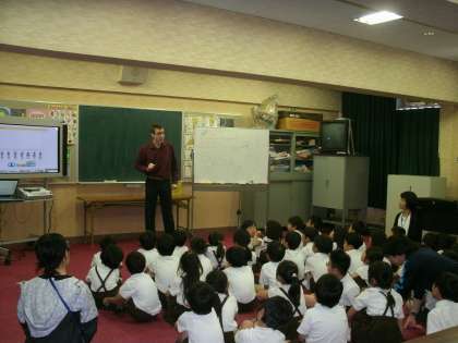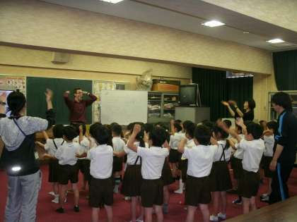 1年生が、外国語活動をしています。体を動かしながら、大きな声で楽しそうに英語の歌を歌っていました。