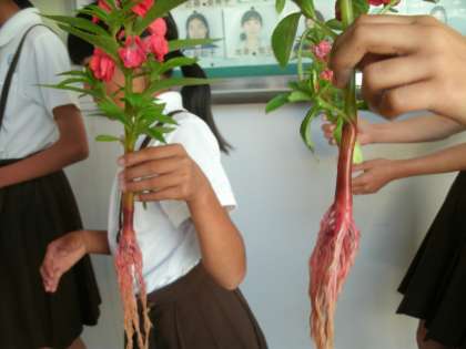 6年生は、理科の学習をしていました。ホウセンカの根や茎の水の通り道を観察していました。
