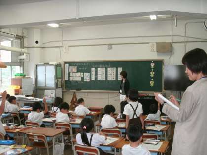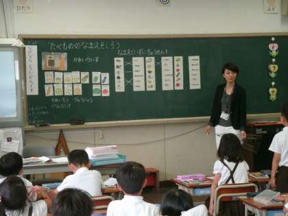 1年1組は、栄養士の先生による「食に関する指導」で「たべもののなまえをしろう」を学習していました。