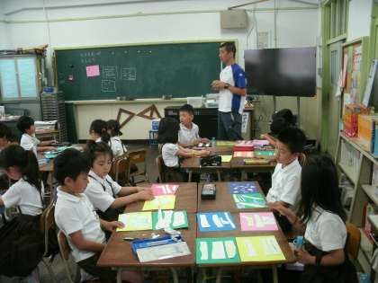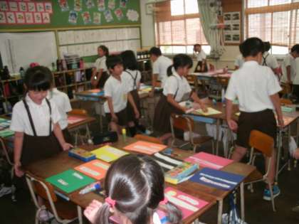 2年2組は、図画工作をしていました。作品を机に並べ、みんなで鑑賞会をしていました。