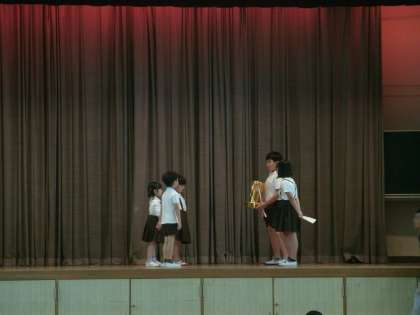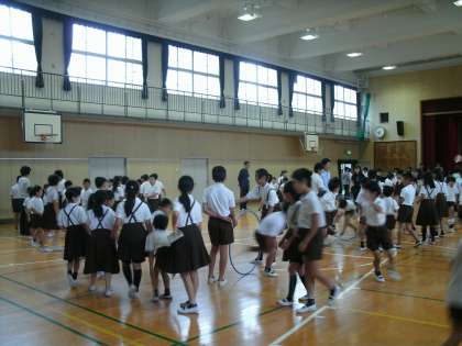 木曜日の朝は、児童集会があります。今日は縦割り班ごとにフープくぐりゲームをしました。集会の最後に、先週実施したリレー大会の表彰式を行いました。