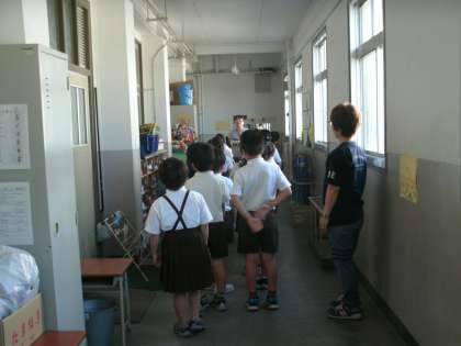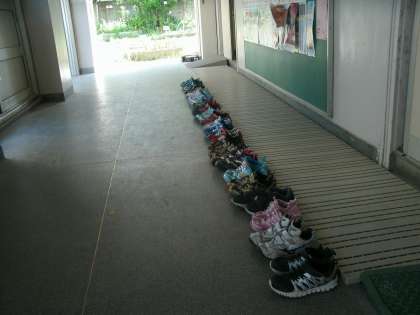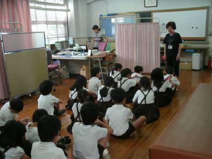 2年2組は、体重測定のために廊下に並んでいるところでした。保健室への移動はとても静かにできます。くつもきれいにそろえてぬいでいました。