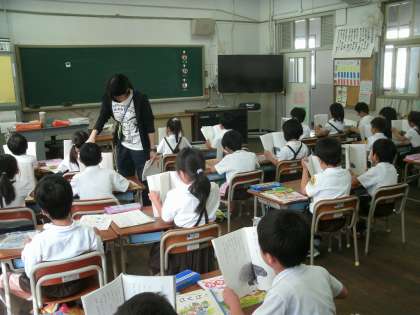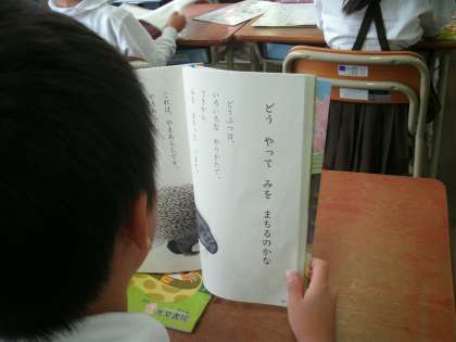1年2組は、国語の学習をしていました。「どうやってみをまもるのかな」という話の音読をしていました。