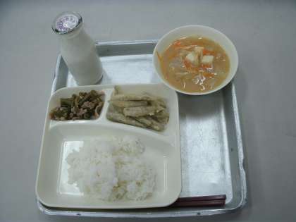 今日の給食は、イワシの天ぷら、みそ汁、豚肉と三度豆のいためもの、ごはん、牛乳です。
