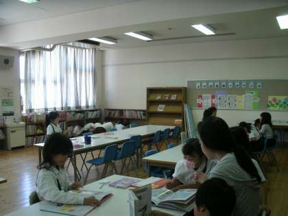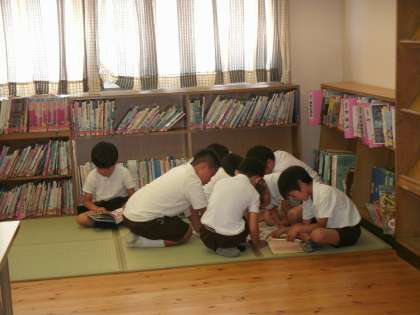 2年1組は、図書室で読書をしていました。やはり、畳コーナーは2年生にも人気でした。