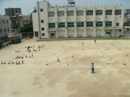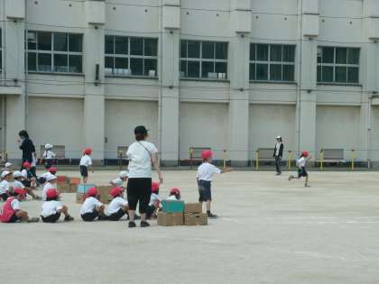 1年生の体育の様子です。折り返しリレーの距離も長くなってきました。走り方も力強くなってきました。走っている友達に大きな声援をおくっていました。