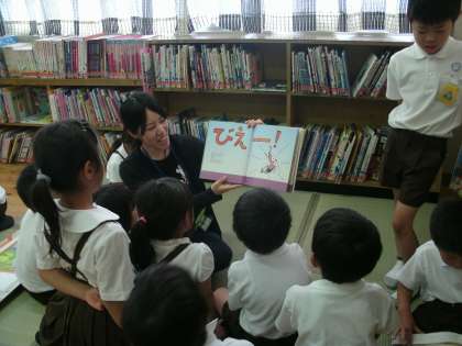 1年2組は、図書室で読書をしていました。担任の先生が絵本の読み聞かせをしていました。
