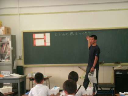 2年1組は、図画工作の学習をしていました。水彩絵の具で「じぶんのいろ」を作っていました。