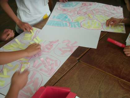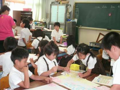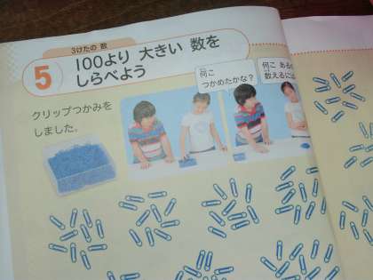 2年2組は、算数の学習をしていました。「100より大きい数をしらべよう」と班ごとに協力して付せんの枚数をしらべていました。さあ、いったい何枚あったのでしょうか。どのように数えたらまちがえることなく数えることができるでしょう。それぞれの班で数え方を工夫していました。