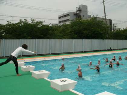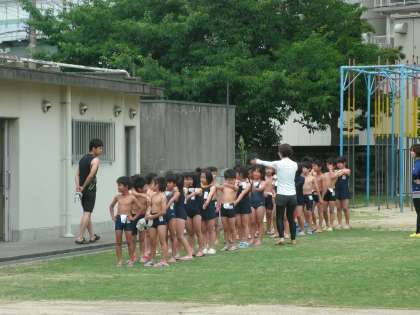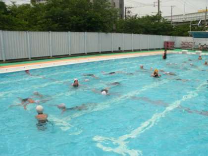 3年生は、プール水泳をしていました。準備運動の後、2人組になってバディーの確認をします。シャワーをあびてプールの中へ。大の字になってふしうきの練習をしていました。