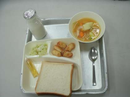 今日の給食は、いかのてんぷら、フレッシュトマトのスープ煮、キャベツのピクルス、食パン、はちみつ、牛乳です。
