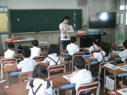 1年2組は、「はやね・はやおき・あさごはん」のふりかえりカードを書いた後、道徳の学習をしていました。「きそく正しい気もちのよい毎日を」というページをひらいて、もう一度、自分の一日の過ごし方をふりかえっていました。「はやね・はやおき・あさごはん」のふりかえりカードとあわせて「規則正しいきもちのよい毎日」を過ごすために、どのようなことに気を付け、実行したらよいのかを考えていました。