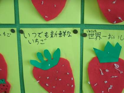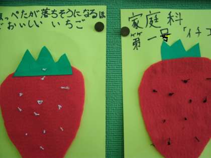 5年生の教室に家庭科の作品が掲示してありました。「玉止め」、「玉結び」がいちごのつぶつぶとしてかわいい作品になっていました。作品名もアイデアいっぱいです。