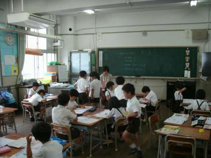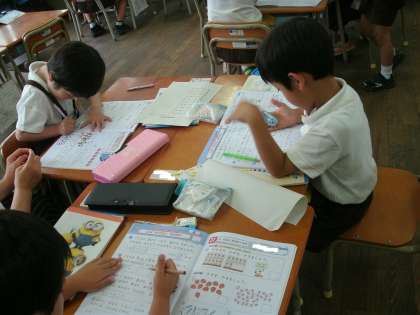 1年1組は、算数の学習をしていました。問題集の練習問題が解けたら、ひとりひとり先生にチェックしてもらいます。問題文をしっかり読んで、たし算か、ひき算か考えていました。
