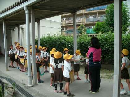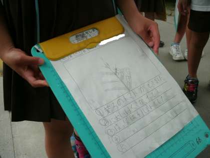 2年2組は、学習園でミニトマトの観察を終え、教室にもどるところでした。観察カードを見せてくれました。