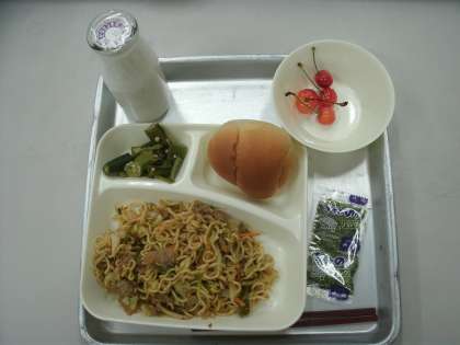 今日の給食は、焼きそば、オクラの中華あえ、さくらんぼ、黒糖クレセントロールパン、牛乳です。