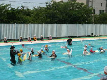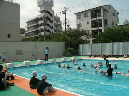 1年生は、プールで着衣泳をしていました。もしもの時を想定し、救助を待つ間の「ラッコ浮き」の練習もしていました。